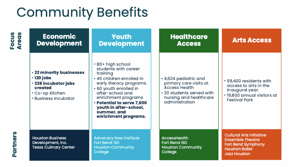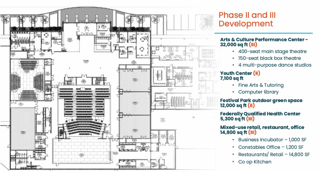 These key components will lay the foundation for future growth, giving youth a space for fine arts and enrichment programs, and offering the wider community access to retail, green space, and public performances. The Festival Park alone is expected to welcome nearly 20,000 annual visitors, providing a unique gathering spot for outdoor concerts, cultural festivals, and wellness activities.