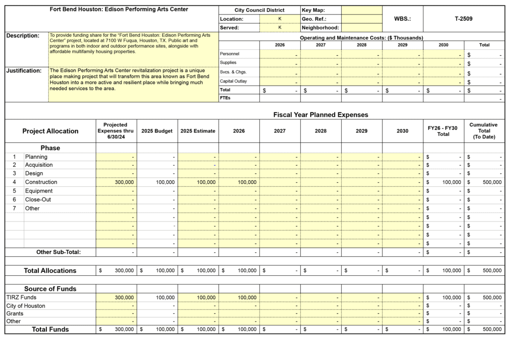 To provide funding share for the “Fort Bend Houston: Edison Performing Arts Center” project, located at 7100 W Fuqua, Houston, TX. Public art and programs in both indoor and outdoor performance sites, alongside with affordable multifamily housing properties.